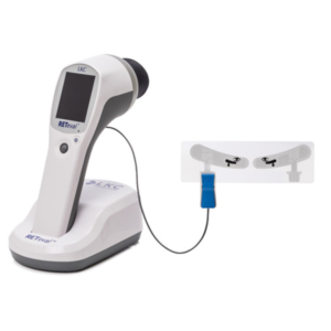 The RETeval is a handheld device used to check how well your retina and optic nerve are working. It is a fast, non-invasive test that uses small, adhesive sensor strips on your skin, similar to an EKG. During the test, the device flashes a light into your eye and measures the tiny electrical signals produced by the light-sensitive cells at the back of your eye. By analyzing these signals, Dr. Secoy can detect functional stress and diagnose and monitor diseases of the eye much better than with physical exams alone. This helps protect your vision by allowing for timely treatment and management of potential issues.